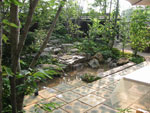 お子様達の成長を機に、遊び場として使われていた殆ど芝生だった庭を全面リガーデン。リビング前は陶板でデッキを造り、アウトリビングとして家族団欒の場に利用。主庭は自然山石を使い渓谷をイメージした流れをデザイン。落葉樹をたくさん植栽し、市中の住宅に居ながら山奥の雑木林のように四季折々の変化を楽しむことのできる庭。 |